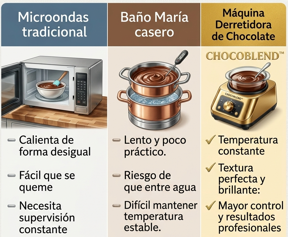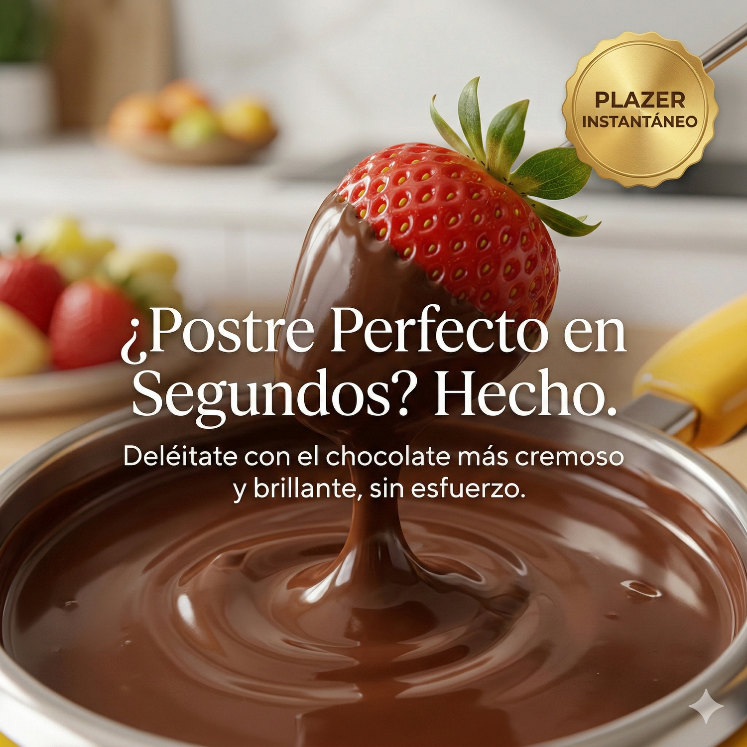 Solo agregas el chocolate, ajustas y listo. Sin técnicas complicadas. Sin baño María. Sin supervisión constante.