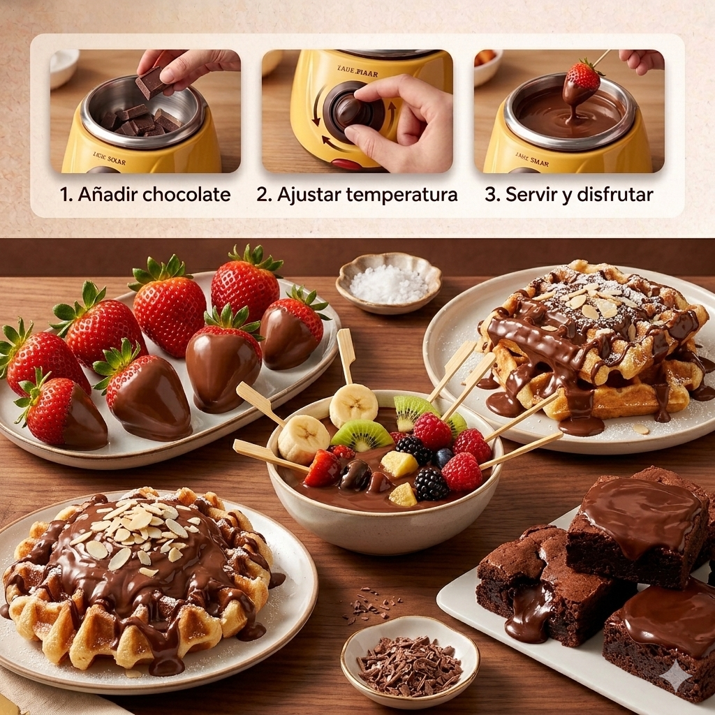 No necesitas experiencia técnica. Solo agregas el chocolate, ajustas la temperatura y listo. Su diseño compacto es perfecto para cocinas pequeñas y su limpieza es rápida y práctica.