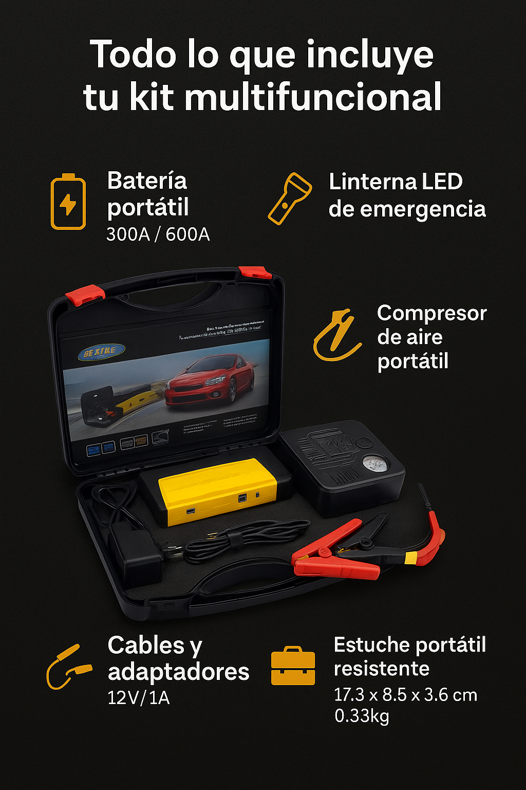 Conoce el Kit de Rescate 2 en 1 de ALTA POTENCIA. Este no es un cargador cualquiera; es tu pase directo a la tranquilidad, empacado en un maletín de diseño premium que querrás presumir.
