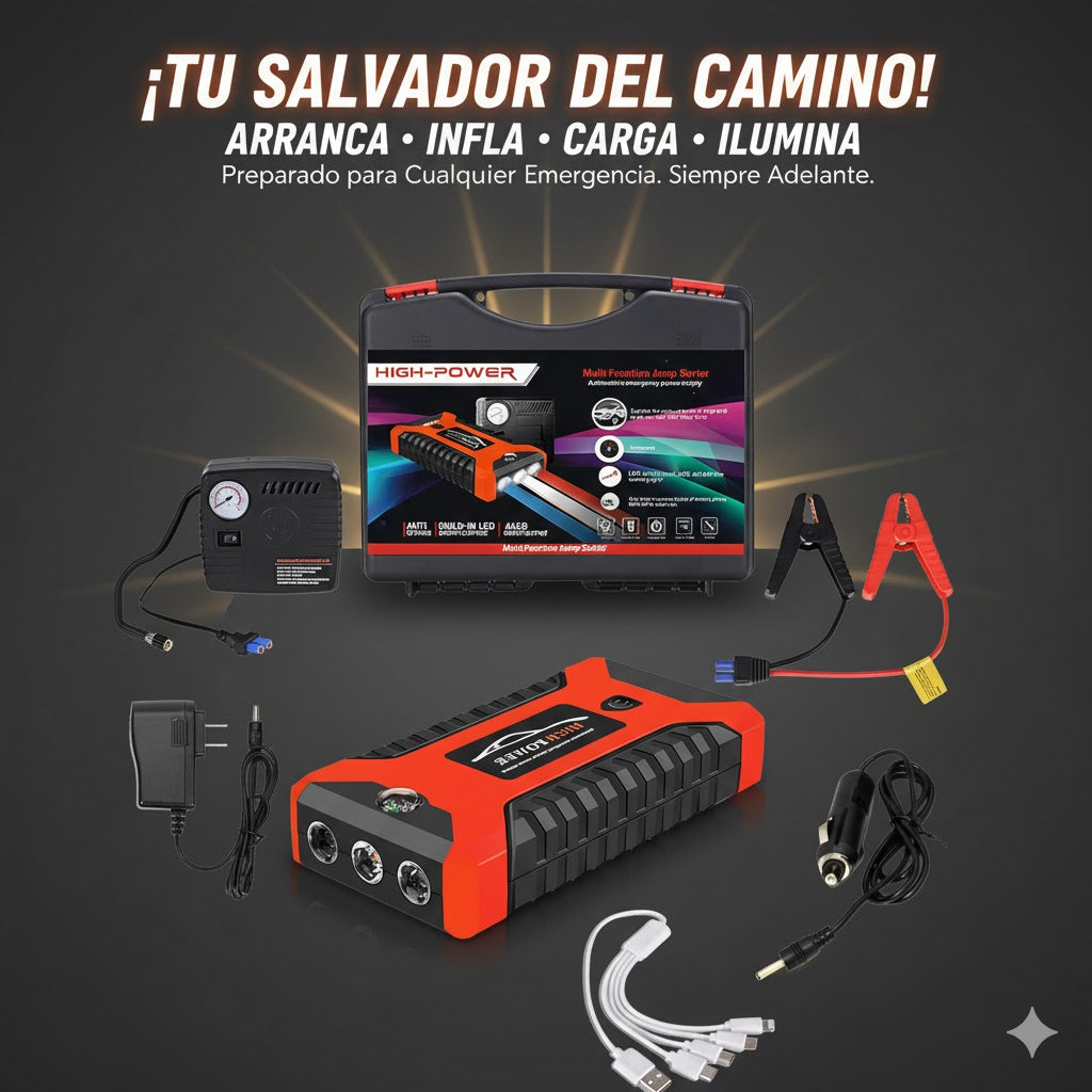 Inflador, arrancador y hasta power bank. No necesito llevar nada más, este High Power me resuelve cualquier emergencia. Me encanta que el inflador se apaga solo al alcanzar la presión exacta.
